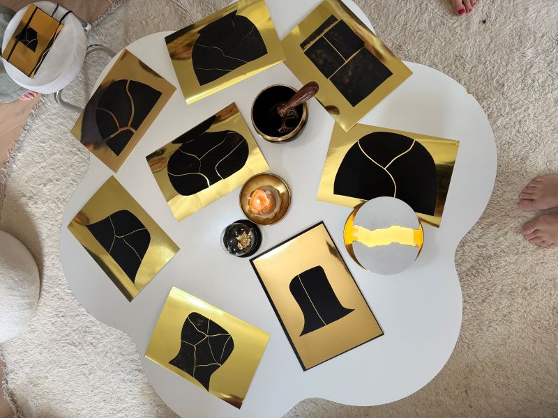 Ces thèmes ne sont pas abordés de manière théorique ou abstraite : ils prennent corps à travers des temps de réflexion, d’introspection guidée, des gestes psychomagiques, et surtout une expérience créative centrale : la réalisation de votre propre Kintsugi.